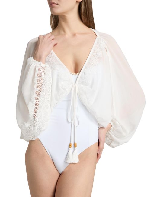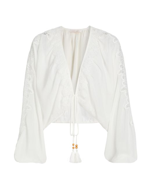 Ramy Brook's Angie blouse is designed with a deep V-neck and fastens with a tie closure. V-neck Long sleeves Front tie closure 100% polyester Dry clean Imported SIZE & FIT About 23" from shoulder to hem Model measurements: 5'10" tall Model is wearing a US size Small. Outerwear And Swimwear - Contemporary Swim > Ramy Brook > Saks Fifth Avenue. Ramy Brook. Color: White. Size: XS.