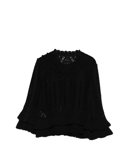 black knit construction scallop trim layered hem open stitch detailing crew neck