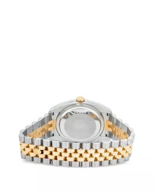 silver and gold mother of pearl dial round case shape diamond markers fluted bezel date window jubilee bracelet automatic movement Condition: EXCELLENT. This previously owned item is in near-perfect condition with no signs of damage or use.