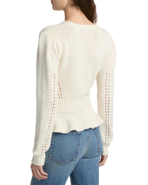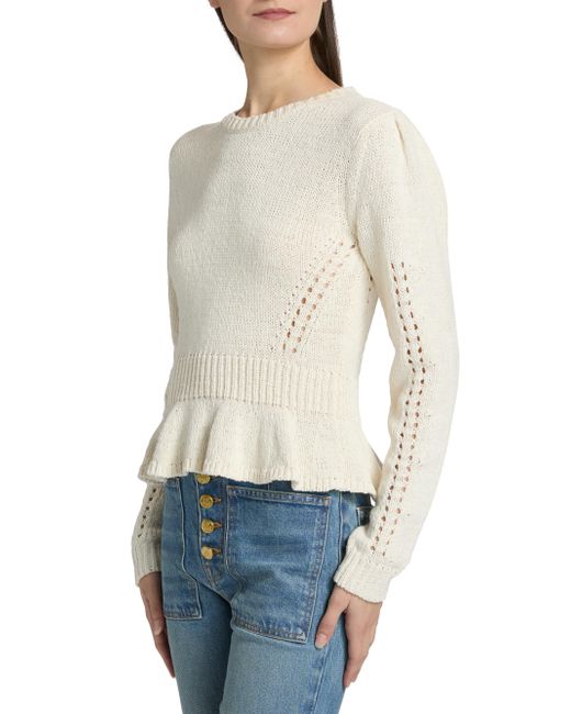 The Aurelie open-knit pullover sweater from Ulla Johnson is designed with a peplum waist. Crewneck Long sleeves Peplum waist Pulls over 66% cotton/34% polyamide Machine wash Imported SIZE & FIT About 21.25" from shoulder to hem Model measurements: 5'10" tall Model is wearing a US size Small ABOUT THE BRAND Manhattan-based designer Ulla Johnson credits her archaeologist parents as inspiration for her namesake ready-to-wear label, founded in 1998. Natural fibers, easy fits and meticulous finishes are seen in each collection, which incorporate sweeping silhouettes, and printing and dyeing techniques from around the world. Contemporary Sportswear - Contemporary Lifestyle > Ulla Johnson > Saks Fifth Avenue. Ulla Johnson. Color: Cowrie. Size: XS.