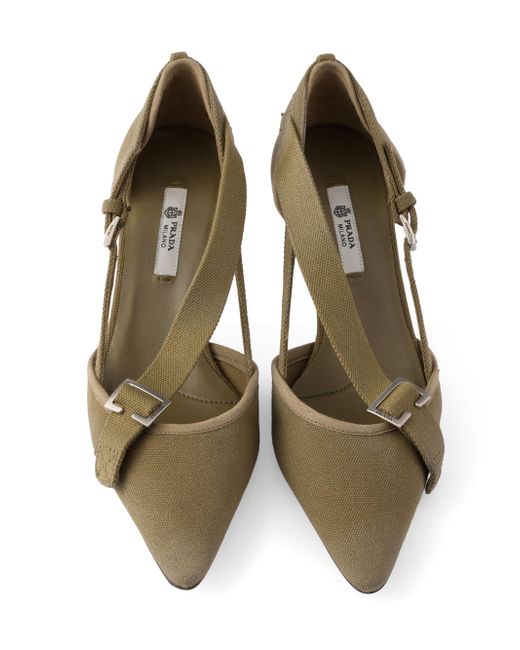 Upper with logo-engraved metal buckles Leather sole and rubber heel tip with metal lettering logo Fabric-covered heel, height 45 mm / 1.8'' Imported 100% Cotton. Lsd Rtw - Prada Rtw > Prada > Saks Fifth Avenue. Prada. Color: Khaki Green. Size: 5.