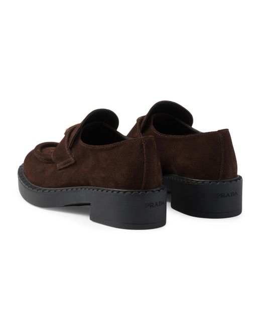 Upper with suede band Enameled metal triangle logo Monoblock rubber sole, 50 mm / 1.9'', with hot-stamped logo Notched-effect rubber welt Imported 100% Calf Leather. Lsd Rtw - Prada Rtw > Prada > Saks Fifth Avenue. Prada. Color: Dark Brown. Size: 8.