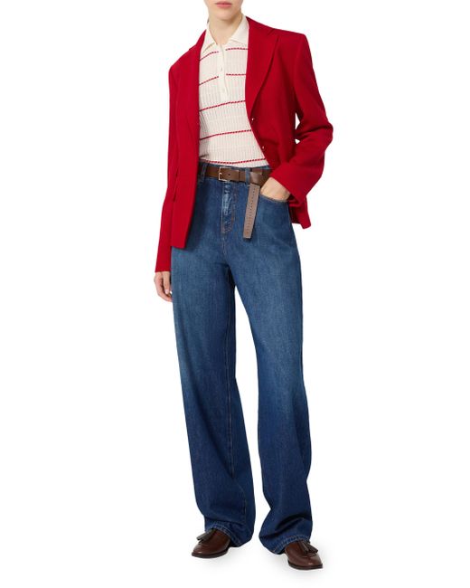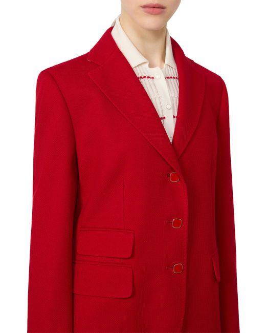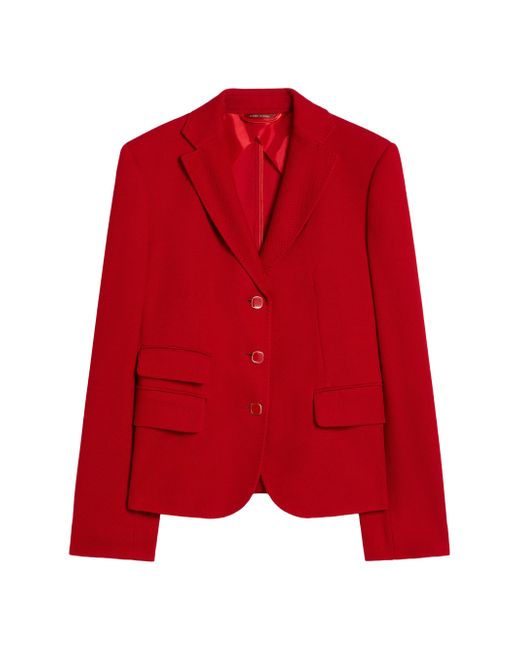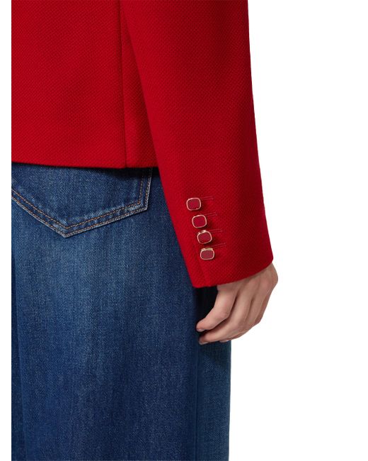 Single-breasted jacket with a feminine, figure-skimming cut. Jacket in double-faced wool and cotton piqué jersey fabric Lapel collar Set-in sleeves with enamel buttons at the cuff The front fastening comprises 3 enamel buttons Three welt pockets with flap on the front Central vent on the back Half-lined model Jersey fabric 64% virgin wool, 36% cotton, lining 70% acetate, 30% polyester Do not wash, do not bleach, do not tumble dry, cool iron, professionally dry clean perchloroethylene - mild process, do not wet clean, wash the garment while it is fastened, do not iron the buttons, turn the articles inside out before washing Imported. Lsd Rtw - Womens Rtw Lsd Mp > Max Mara > Saks Fifth Avenue. Max Mara. Color: Red. Size: 0.