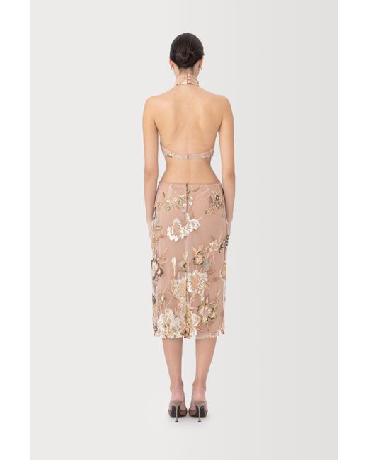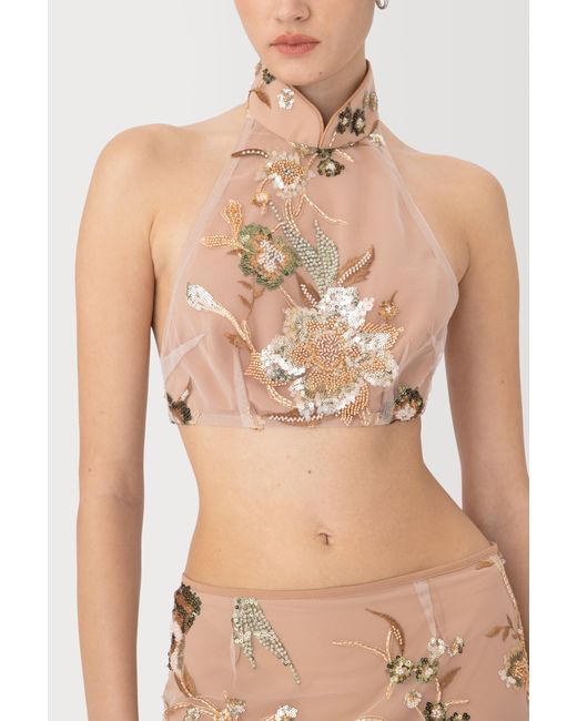 The Eliza top is a halter neck crop top crafted from elaborately embellished fabric featuring sequins and delicate beads. Its mandarin collar and open back create a modern yet sophisticated look. Pair it with the Eliza skirt for a versatile ensemble.