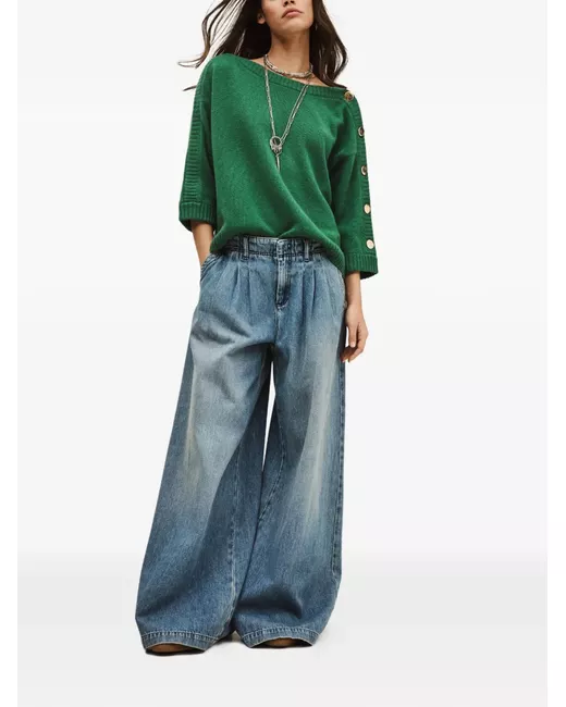 green gold-tone hardware ribbed trims shoulder button-detail three-quarter sleeves round neck