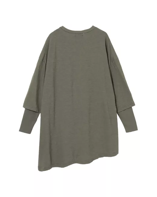 khaki grey cotton round-neck long sleeves chest-pocket asymmetrical uneven hem