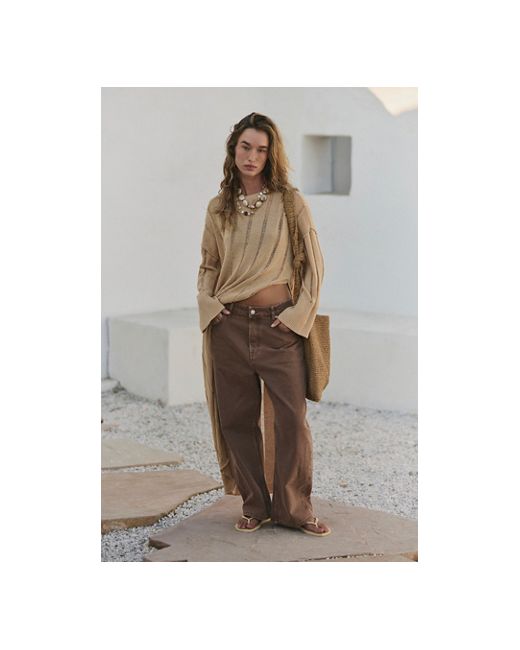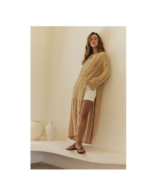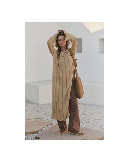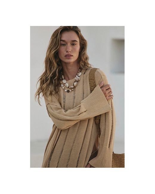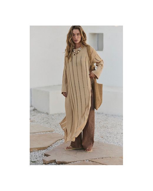 Sheer stripes, a high side slit, and a billowing silhouette make this maxi sweater from free-est the perfect stand-out style. * Ribbed crew neckline * Distressed striped pattern * Maxi length * High side slit * Long sleeves with ribbed cuffs Echo Sweater Tunic by free-est at Free People in Natural Sand, Size: XS