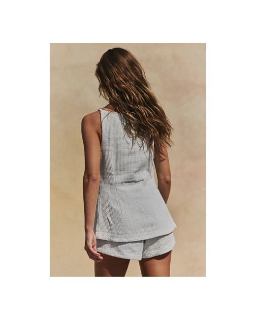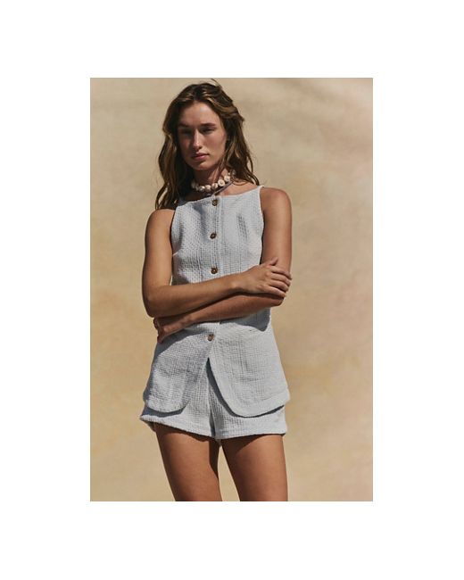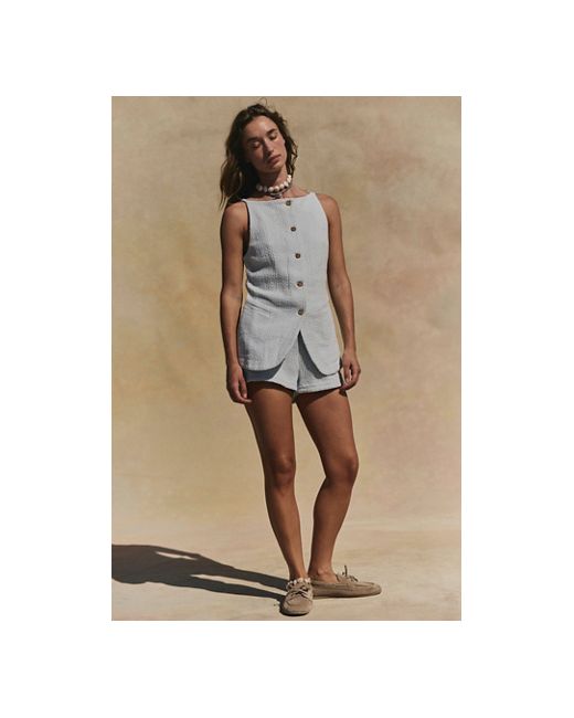 So chic with vintage-inspired charm, this set from our free-est collection will have everyone asking you, " Where did you get that?" **Fit:** Top: Longline, fitted silhouette; Shorts: Relaxed fit that sits at the natural waist **Features:** Top: High-neckline, button-up closures, peplum-style split hem, side jetted pockets; Shorts: Pull-on style, flat front and back, coordinating textured woven fabrication **Why We ❤ It:** Sleek with platforms or off-duty with sneakers, this set has endless ways to wear. Coastal Classy Set by free-est at Free People in Morning Frost, Size: XS
