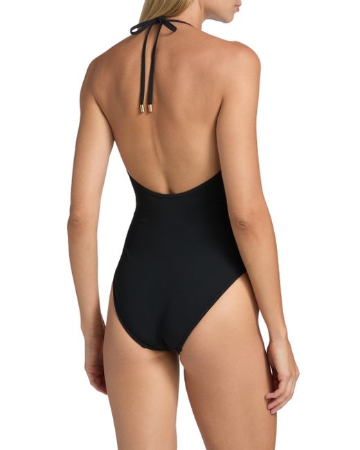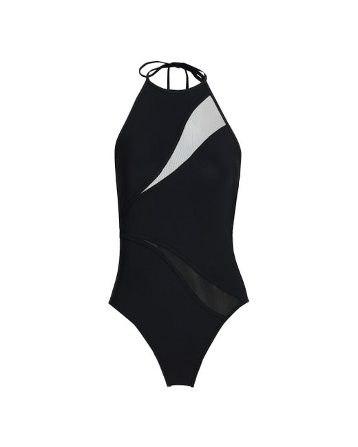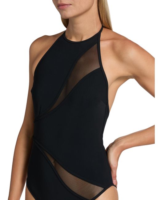 Zimmermann's Wanderlust swimsuit features an open-back helterneck design with asymmetric spliced mesh inserts. Halterneck Pulls on 75% polyamide/25% elastane Combo: 81% polyester/19% elastane Lining: 92% nylon/8% elastane Hand wash Imported. Outerwear And Swimwear - Contemporary Swim > Zimmermann > Saks Fifth Avenue. Zimmermann. Color: Black. Size: 2.