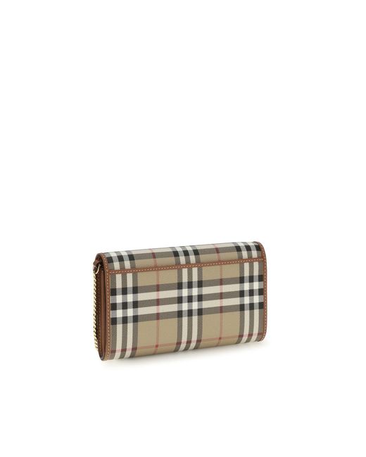 The Chain Wallet by Burberry is an elegant and functional accessory. It features a chain shoulder strap and a flap with a snap button for secure closure. Inside, it has 12 card slots, one zippered compartment, two internal compartments, and two slip pockets, offering ample organizational capacity. The edges are hand-painted, while the polished metal elements add a touch of sophistication. A perfect combination of style and practicality. Season: SS26 Dimension: 20.5x12x3.5 Composition: 55% Polyurethane 25% Polyester 20% Cotton