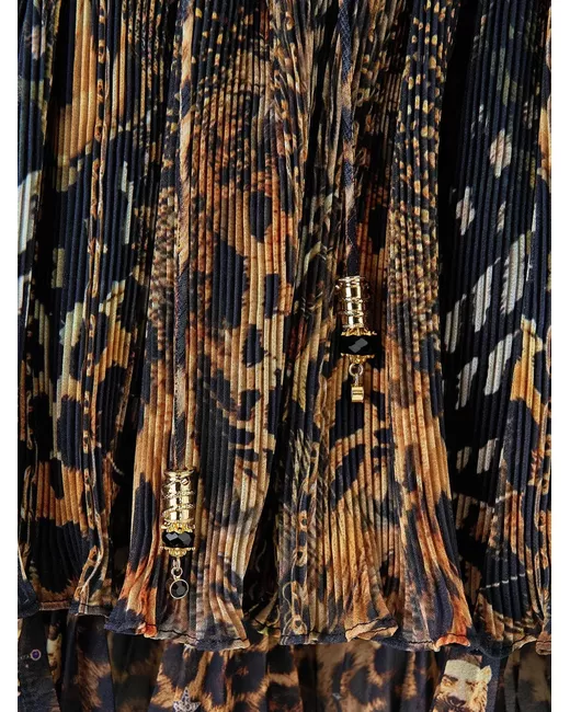 brown feline folklore pleated design short sleeve ruffle-trim drawstring detail beaded-detail