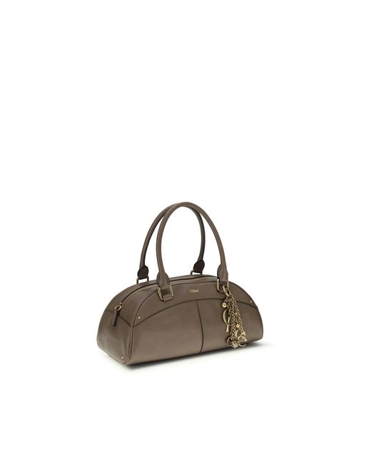 Chloe Ladies Shoulder Bag. SKU: CH26SS955Q86_28H. Size: W 33 x H 15 x D 15 cm. Chloe Bowling Handbag. The bowling handbag by chloe, crafted from smooth calfskin leather, features a structured, rounded silhouette with sturdy top handles. the interior includes a large main compartment and flat pocket, while the zipper closure provides convenience and security. the removable golden key ring, embellished with dangling charms and the letters chloe, adds a distinctive touch and celebrates the elegance of the maison's heritage. Composition: 100% % Calf Leather Bos Taurus. Made in Italy.