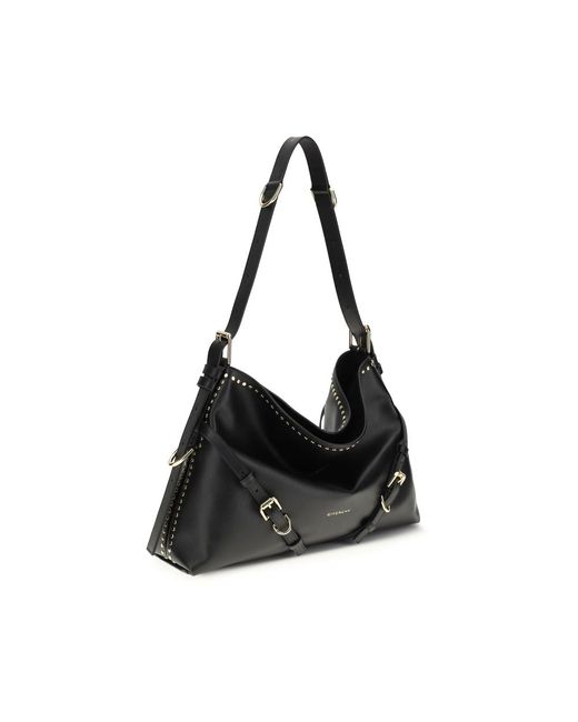 The large Voyou Shoulder Bag in shiny leather by Givenchy is an elegant and functional accessory, crafted from fine smooth calfskin leather with a soft V-shaped silhouette and generous proportions. Featuring an adjustable shoulder strap, it can be carried by hand, on the shoulder, or across the body. The embossed signature on the front and shoulder strap, together with the Paris appliqué inside and gold-finish metal buckles, add a distinctive touch. The main compartment and internal zip pocket ensure practicality and organization. Season: SS26 Dimension: 48x38x10 Composition: 100% Calf Leather Bos Taurus