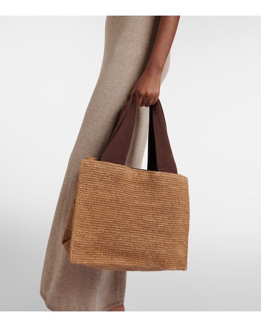 Material: straw, cotton. Lining: unlined. Made in Madagascar. Designer color name: The. Trim: leather. Closure: self-tie closure. Top handle. Internal details: internal slot pocket.