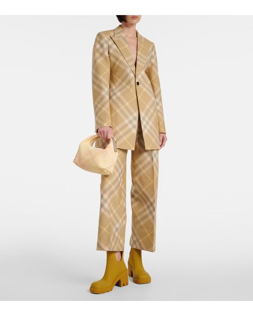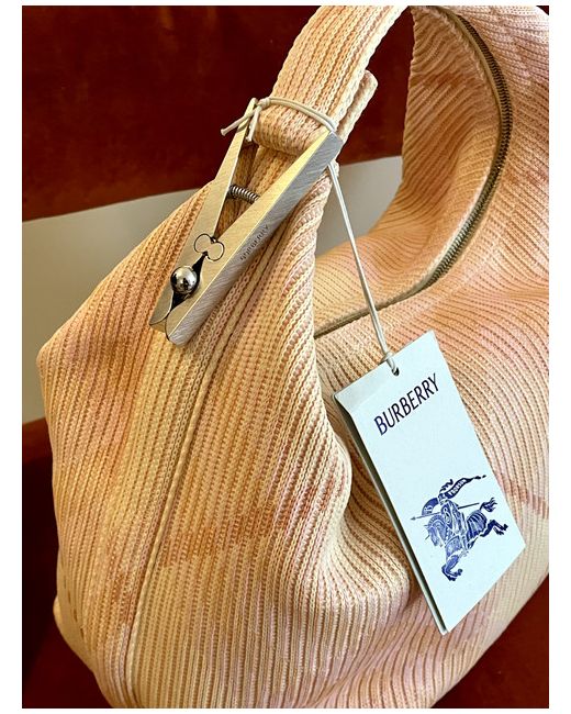 A softly structured bag knitted in Italy with the Burberry Check. The lightweight, unlined style has a logo-engraved peg clip to secure the curved top handle. – Engraved Burberry lettering at peg. Browse our other Burberry bags for sale.