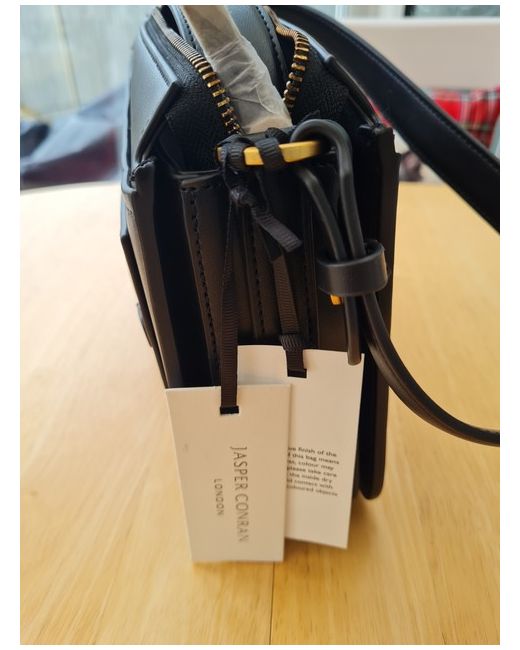 The Jasper Conran ladies handbag is a stylish medium-sized bag with a sleek black exterior made from polyurethane. The bag features a black polyester lining, black polyurethane handle/strap, and gold hardware. This versatile crossbody style handbag has a width of 26 cm and a height of 20 cm, making it the perfect accessory for any woman's wardrobe. The Jasper Conran brand is known for its quality craftsmanship and chic designs, making this handbag a must-have for those who appreciate style and functionality.
