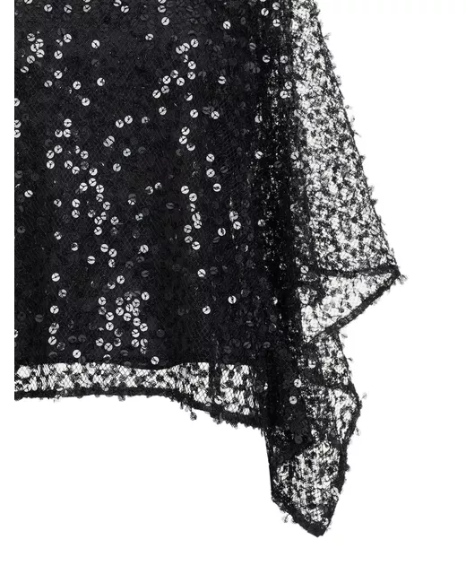 This blouse is crafted from airy mesh that creates the illusion of sequins floating weightlessly against the skin. Midi-length draped sleeves add a sense of fluidity, while the soft shimmer of each sequin catches the light with graceful ease. draped sleeves bateau neckline pullover style cropped silhouette