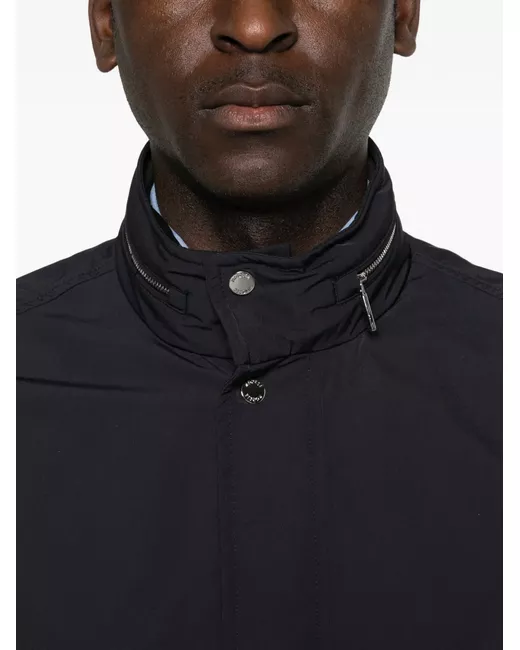 dark blue flap pockets ribbed trims front button fastening high neck zip detail
