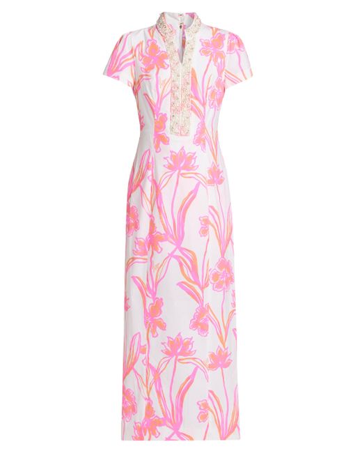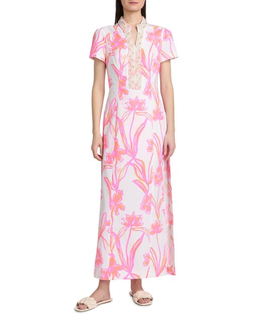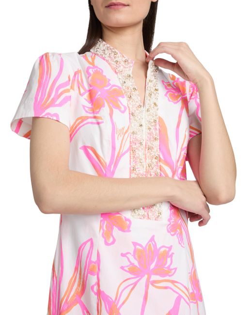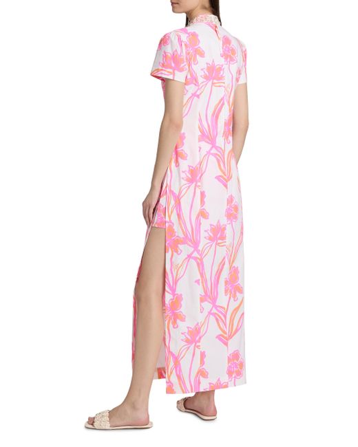 Crafted of stretch poplin cotton, Lilly Pulitzer's Velora maxi romper features a bright floral print, embroidered split neck, and interior shorts. Split neck Short sleeves Concealed back zip closure 98% cotton/2% spandex Hand wash Imported SIZE & FIT About 57" from shoulder to hem Model measurements: 5'10" tall Model is wearing a US size 4. Modern Collections - Lilly Pulitzer > Lilly Pulitzer > Saks Fifth Avenue. Lilly Pulitzer. Color: Resort White. Size: 0.