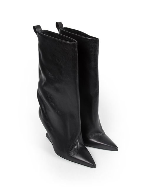 Dark glamour in sculptural form. These boots embody Rick Owens' radical silhouette language. Sharp, flared, and confrontational. The cantilever heel creates a sense of tension and suspension, while the grainy leather adds a raw, tactile depth. Severe, architectural, and unapologetically directional.