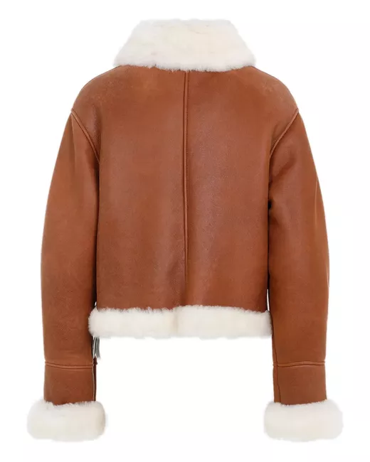 brown leather front button fastening spread collar drop shoulder long sleeves shearling trim two side slit pockets shearling lining straight hem