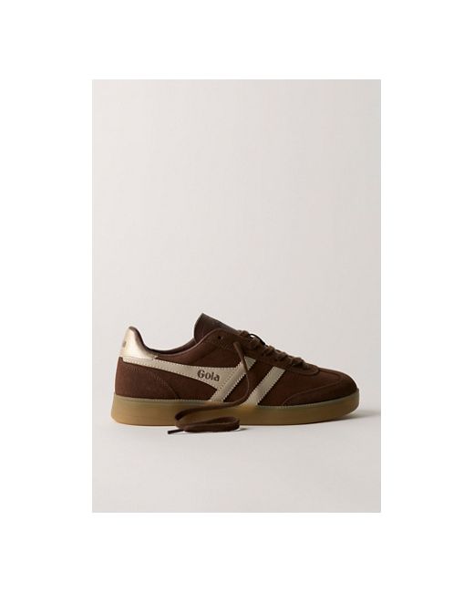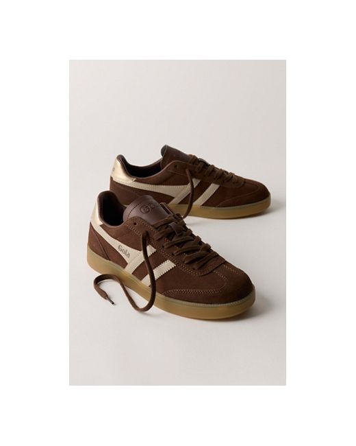 These so-cool sneakers are featured in a colorblock suede and leather design with a classic T-toe and gum rubber soles for a retro look. **Features:** Low-top style, padded collar, sleek tongue; embossed logo, lace-up vamp, round T-toe, suede fabrication, leather overlays, logo detailing, gum rubber soles **Why We ❤ It:** Pair with a playful sock for a fun ‘fit. Gola Viper Sneakers at Free People in Dark Brown/Bone/Gold, Size: US 6
