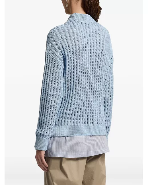 cornflower blue open knit crew neck long sleeves ribbed trim
