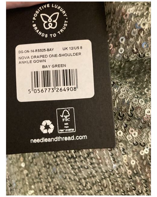 The Needle & Thread Size 12 Nova Draped One Shoulder Draped Ankle Gown is a stunning and elegant dress perfect for a special occasion. This sleeveless gown features a one-shoulder design and a draped ankle hem, adding a touch of sophistication to your party or cocktail event. Made from polyester, this long silver dress is designed for a special occasion making it a chic choice for any woman looking to make a statement at a fashionable event. Remember to dry clean only to keep this exquisite piece looking its best.Please refer to photos for imperfections.Unfortunately no spare sequins .I have never worn this but I have managed to get a make up mark on the inside lining, which i have done my best to photograph but as is in lining does not show .RRP £450 New Thank you for looking