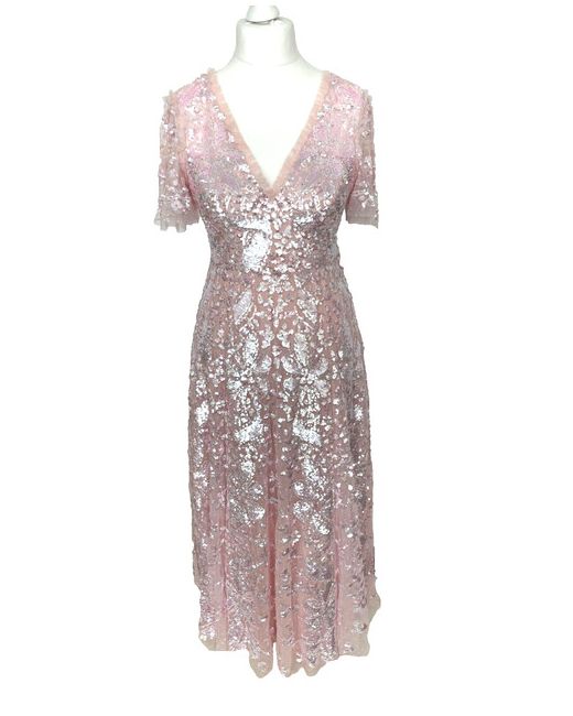 Needle & Thread long dress. Colour: pink with light-catching sequins in pink and shiny white. The dress is made from high-quality polyester tulle material. This dress is available in size 12 (UK) or US8, and is suitable for all seasons.