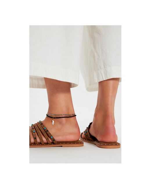 Adorned with colorful stones and metal studs, these endlessly cool sandals from FP Collection complement any outfit, featuring studded thin suede straps, a toe strap for a supportive fit, and a soft, embellished footbed for added dimension and comfort. * Strappy suede uppers with studded embellishments * Backless, slip-on sandals * Squared open toe * Flat rubber outsole Santa Fe Sandals by Free People in Cognac Suede, Size: US 7