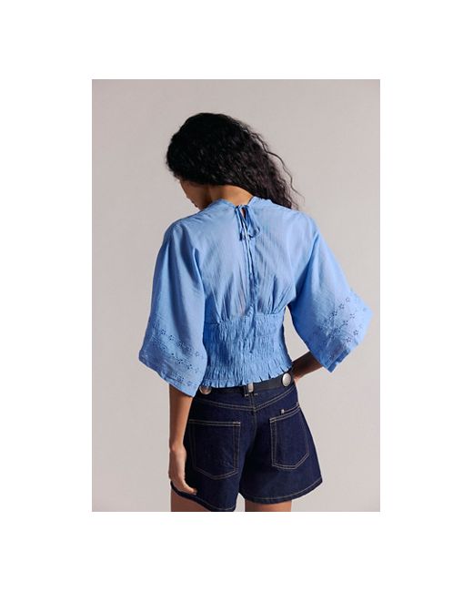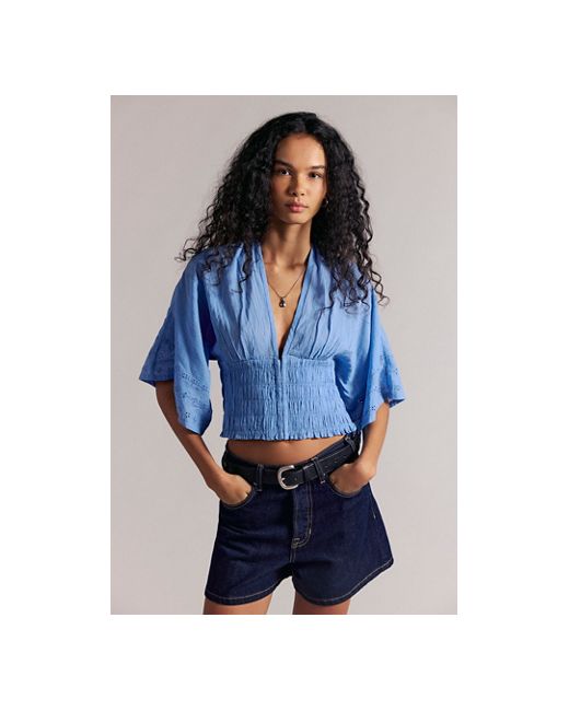 Effortlessly airy, this breezy short-sleeved blouse features a lightweight cotton fabrication, a relaxed bust with a fitted, ruched bodice, and eyelet lace details for a touch of femme. * Plunging V-neckline * Large back keyhole * Back tie design * Hook-and-eye closure Ester Blouse at Free People in Blissful Blue, Size: XS