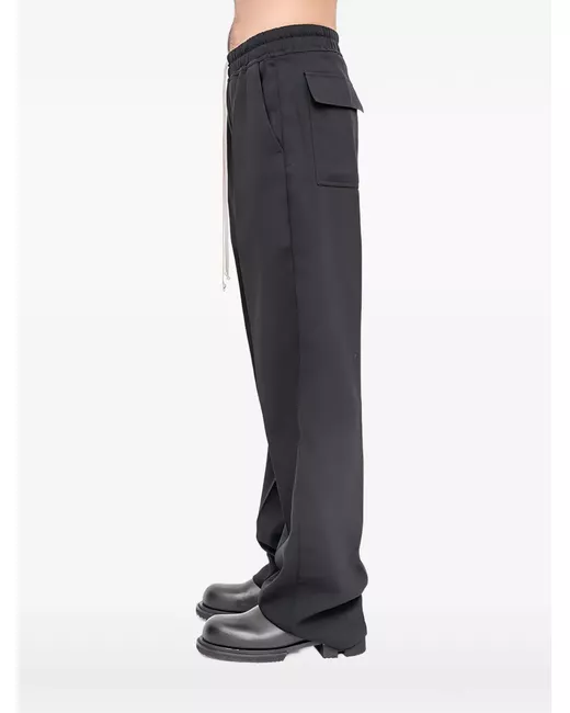 black wool drawstring fastening back flap pockets elasticated waistband