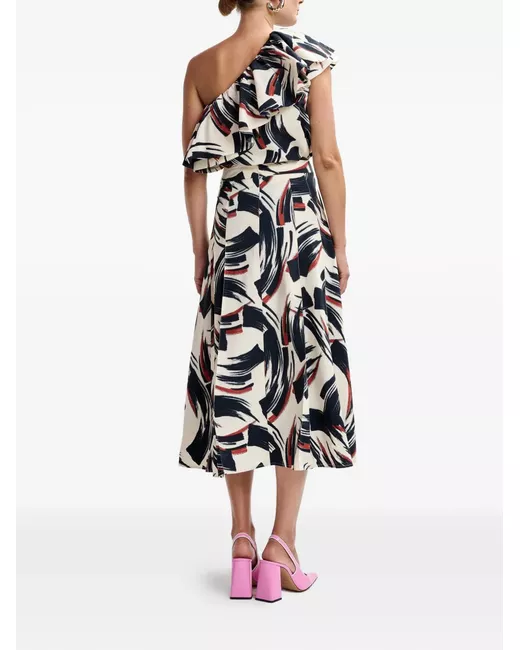 black and off-white ruffle detail asymmetric neck one shoulder abstract pattern