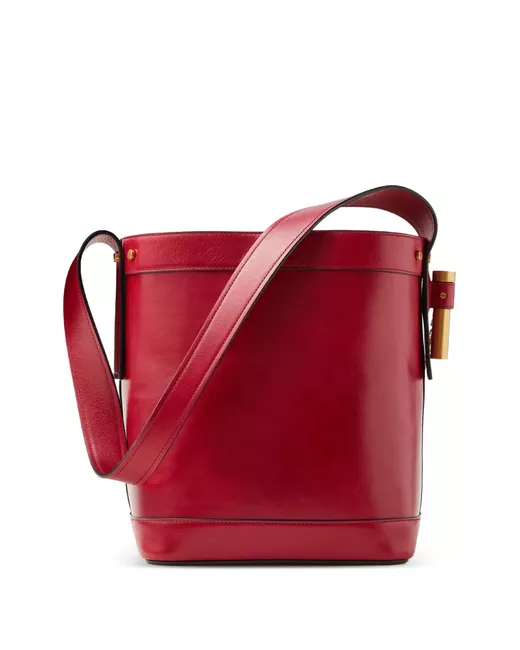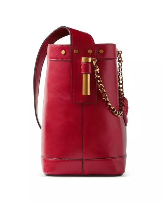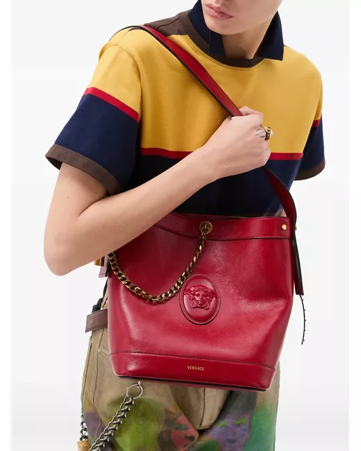 The Pivot small bucket bag is entirely crafted from calf leather, defined by a central Medusa Cameo leather patch—a 3D rendition which captures the depth of Medusa's eyes and winged details in her hair. The accessory is enriched with a chain detail and a secure magnetic leather tab closure. For versatile styling, it can be carried in-hand or worn over the shoulder by the leather shoulder strap. Medusa Cameo leather patch top handles 1 interior flat pocket Interior protector strap Shoulder strap Outer composition: 100% Calf leather Lining: 100% Lambskin Trim: 100% Calf leather