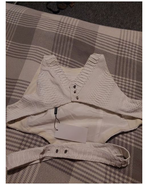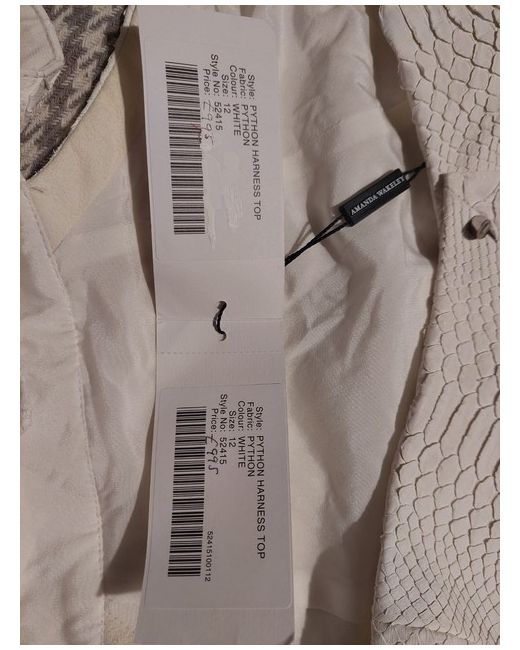 The Amanda Wakeley top is a stylish sleeveless blouse in ivory, featuring a cropped style with a round neckline. Made from python material, it is designed for a regular fit in size 12. This top is perfect for adding a touch of elegance to any outfit, whether dressed up or down.
