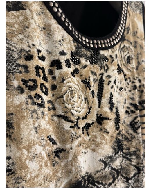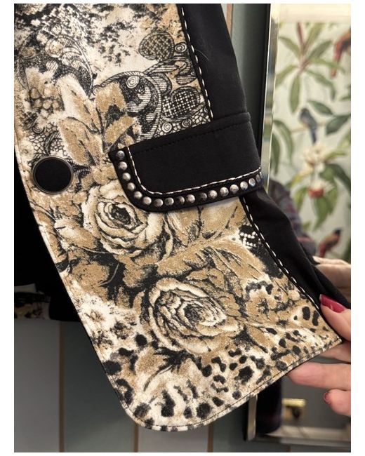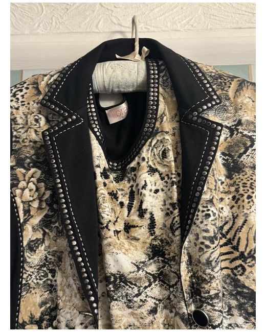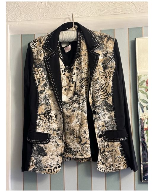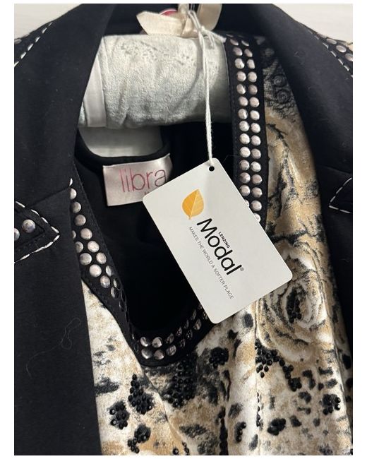 The Libra Designer Twin Set NWT with mock pockets is a stylish and sophisticated addition to any woman's wardrobe. Made from a luxurious blend of modal, cotton, and spandex, the crystal accents and studded detail are in both pieces. The jacket has feature buttons.The twin set features a black and beige colour palette with an abstract animal print design. Perfect for a designer look, this set is hand wash only to ensure longevity and is designed for a regular fit in size M. Ideal for both casual and special occasions, this twin set exudes elegance and style.