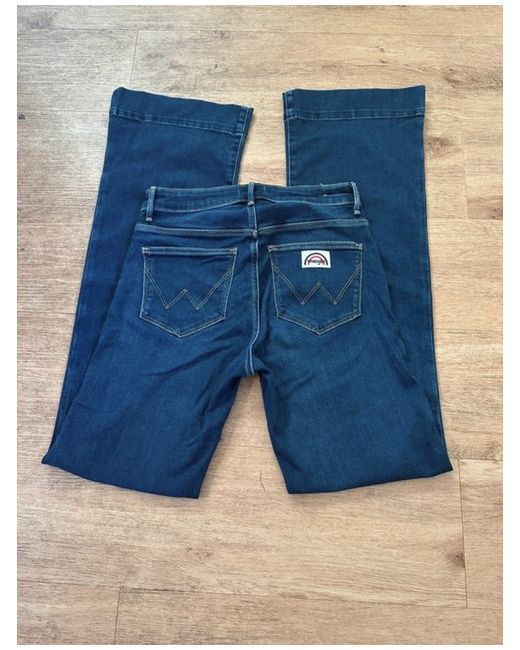 The Wrangler Women's Blue Jeans in size XS feature a classic 5-pocket design with a zip closure. Made from denim fabric, these everyday essentials are machine washable for easy care. The jeans are adorned with the iconic Wrangler logo and come in a timeless blue colour, perfect for spring. With a flared style, they offer both comfort and functionality for any casual outfit.