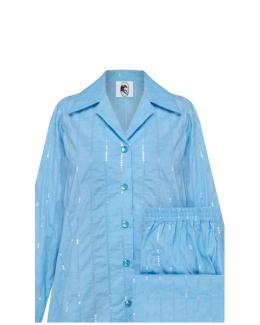 The Sleeper Sequined Poplin Cotton Pajama Set in Blue, Size M, features a stylish sequin stripe pattern on a luxurious poplin cotton fabric. With a collared neckline, long sleeves, and button closure, this set exudes a lavish and comfortable feel perfect for all seasons. The beautiful blue colour and sequin accents add a touch of glamour to your bedtime routine, making it a must-have for any woman looking for high-quality and stylish nightwear. Made in the Ukraine by the brand Sleeper, this pajama set is a new addition with an RRP of £335. Dry clean or hand wash cold. Measurements in the photos are approximate. Actual colour may differ from photos due to lighting The parcel will be shipped from a pet and smoke free house in reused packaging materials
