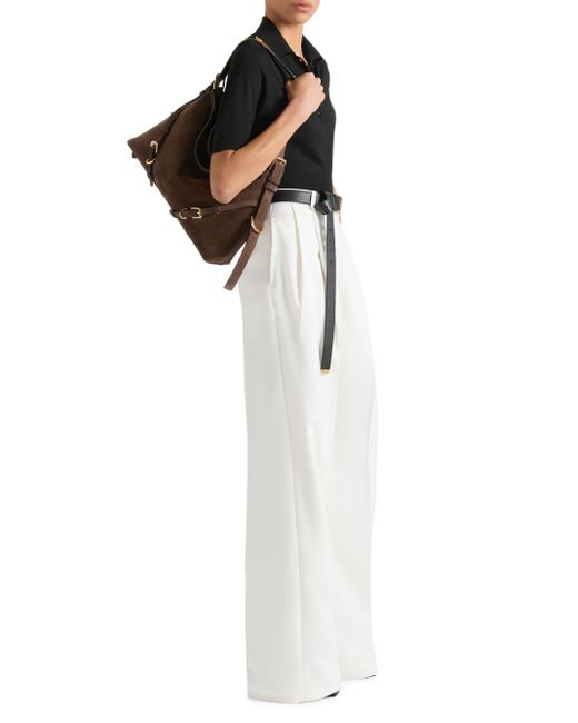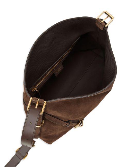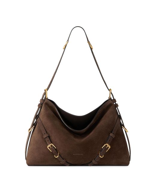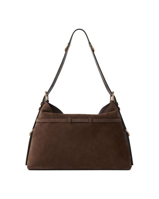 Medium Voyou bag in suede. Medium shoulder bag in suede calfskin leather Voyou line V-shaped slouchy silhouette and generous volume Adjustable shoulder strap offering hand, crossbody or shoulder carrying Givenchy signature embossed on the front of the bag and on the top of the strap Givenchy Paris patch on the inside Givenchy engraved metal buckles Golden-finish metal details One main compartment and one zipped pocket inside Canvas lining 15 x 12.2 x 3.9 in. Composition: 100% calfskin leather Made in Italy. Lsd Handbags - Givenchy > Givenchy > Saks Fifth Avenue. Givenchy. Color: Ebony Brown.