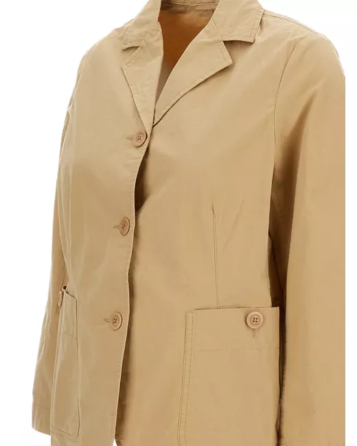 beige button fastening notched lapels patched front pockets back slit long sleeves
