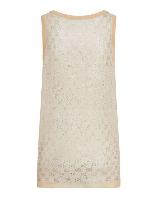 - Wide round neckline with ribbed trim- Sleeveless with ribbed edges- Semi-sheer knit construction- Jacquard knit with iconic monogram- Ribbed straight hem- Straight, flowing silhouette- Regular fit- 100% silk- Color: Shell Pink