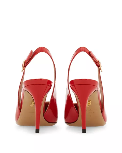 The silhouette of this stunning slingback is the very essence of contemporary sensuality. Cut from patent calfskin leather this impeccable shoe has a rounded tip and slim heel positioned externally for a more modern appeal. A golden Gancio buckle completes the design. heel: 7 cm composition: patent calfskin made In Italy