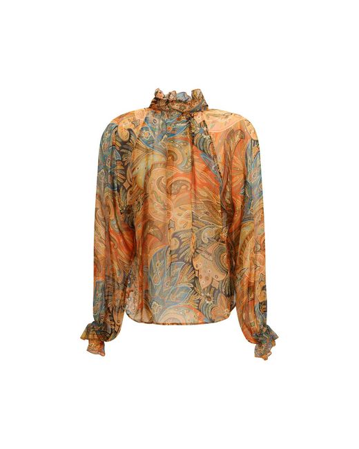 The paisley ruffled Shirt by Etro embodies the brand’s signature bohemian sophistication. Crafted in vibrant orange with a multicolour paisley motif, it is defined by decorative ruffles that add movement and lightness to the design. Featuring a classic collar, front button fastening, long sleeves, and gathered cuffs, it creates a soft yet refined silhouette. A fluid and expressive piece, perfect for distinctive, statement styling. Season: SS26 Fit: Oversize Composition: 100% Silk