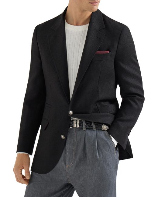 Silk, linen and wool hopsack deconstructed blazer with metal buttons. 3-roll-2 closure with metal buttons Peak lapel Cuffs have four metal buttons and functional button holes Welt pockets with flap, ticket pocket and chest pocket Cupro half lining Two interior pockets with button closure and pen holder Double back vent Drop 7 Request dry cleaning at specialist cleaner's only, do not bleach. Do not tumble dry, iron at low temperature 49% silk / 31% linen / 20% wool Made in Italy. Lsd Rtw - Brunello Cucinelli Rtw > Brunello Cucinelli > Saks Fifth Avenue. Brunello Cucinelli. Color: Black. Size: 32.
