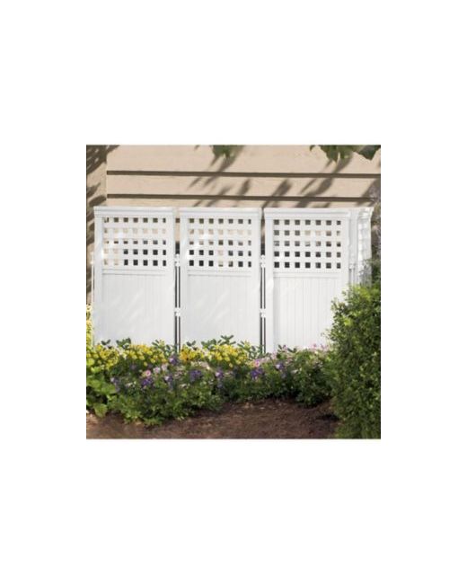 The Suncast 4 Panel Screen Enclosure Freestanding Steel Resin Reversible Panel Outdoor Screen encloses and decoratively hides unsightly items around your home or even in your yard. Suncast's decorative screen privacy enclosure is the perfect solution to concealing an air conditioner, garbage can, trash dumpster, and much more. The decorative wicker rattan and features a beautiful, contemporary design that will look great on almost any patio or in any yard. This screen is durable, while the steel posts include a powder-coated finish to ensure long-lasting durability. This Suncast enclosure multi-part fence unit is a 4 part fence with 5 posts that can be arranged in a variety of ways, including Zig Zag, "U" shaped, or "L" shaped. The fence's tough, durable, and rugged panels easily attach to the waterproof, powder-coated finished steel posts for a fast headache-free assembly. This screen works best when placed on soft ground, either in the garden or yard.