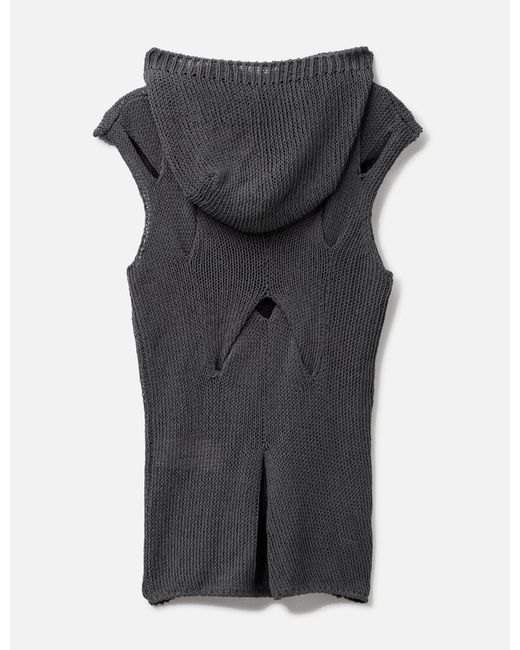 NACHEOut In Knitted SleevelessMade of cotton, acrylic and nylonFixed hoodSleevelessAllover twisted knit pattern and cut-out designMetallic NACHE logo below back hoodMade in KoreaColor: Charcoal