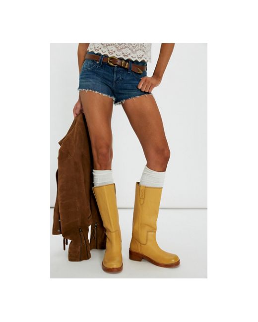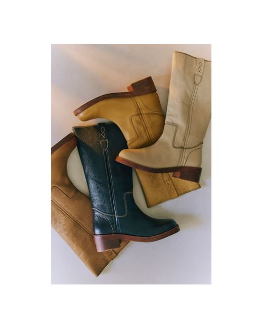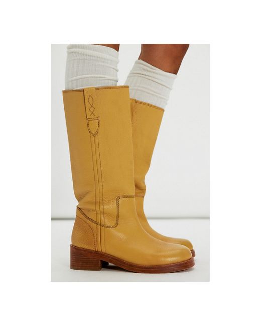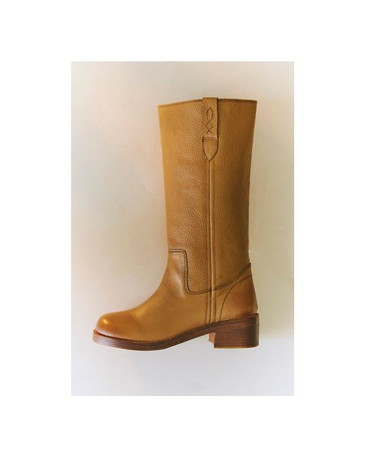 Go vintage in these campus-inspired boots, featured in a tall pull-on style with a squared-off toe and stacked leather sole, complete with distressed details for a lived-in look. **Features:** Pull-on style, tall design, leather uppers, pull straps with embroidered details, square toe, fading at heel and toe, stacked leather block heel **Why We Blaze Pull-On Boots by Free People in Banana Tan Leather, Size: US 6