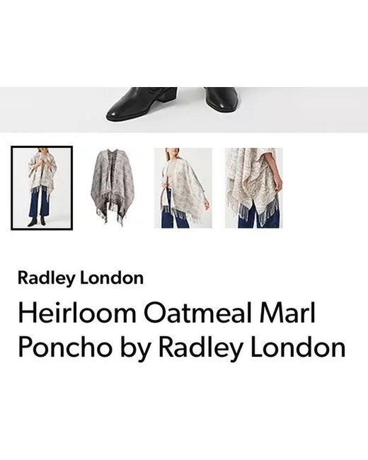 BRAND NEW WITH TAG RRP £89 AUTHENTIC MERCHANDISE BOUGHT FROM A RADLEY STORE IN ORIGINAL PACKAGING RADLEY LONDON : HEIRLOOM DESIGN OATMEAL MARL COLOURS LUXURIOUS PONCHO SHAWL FABRIC QUALITY IS AMAZING WITH RADLEY, LONDON EMBROIDERED ON LOWER PART BEAUTIFUL QUALITY AND RADLEY FOUR-SCOTTIE EMBLEM PRINT DESIGN WITH PRETTY FRINGE TRIM DIMENSIONS: in centimetres : W 140 x H 128 x D 0.2 RIBBON HAS NOT BEEN REMOVED & PONCHO NOT TRIED ON. PLEASE SEE PHOTOS FOR CLOSURE DETAIL & INFO TREAT YOURSELF OR GIVE AS AN AMAZING LUXURY GIFT 🎁