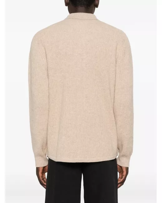 sand beige ribbed knit classic collar button fastening long sleeves straight hem