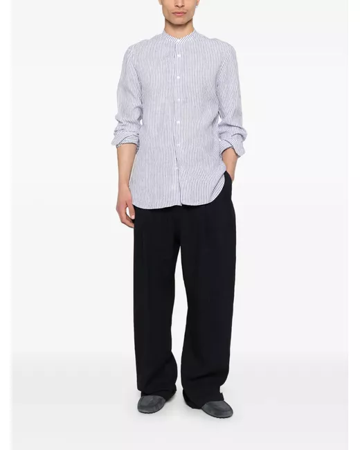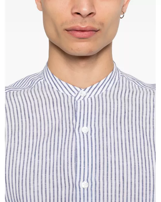 white and blue striped front button fastening band collar buttoned cuffs curved hem